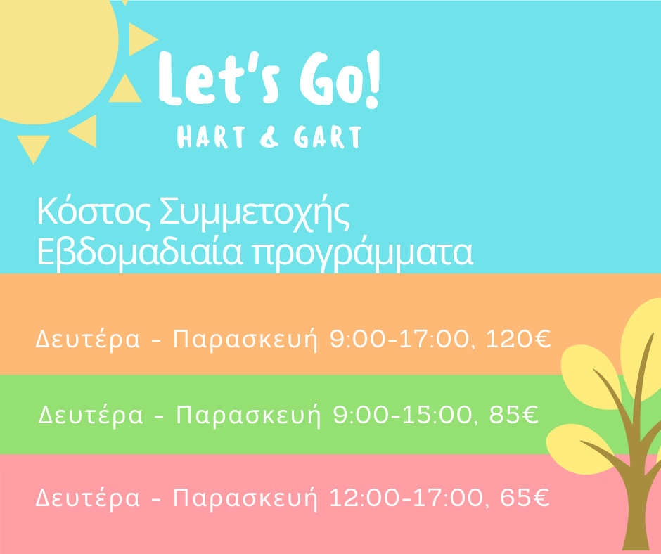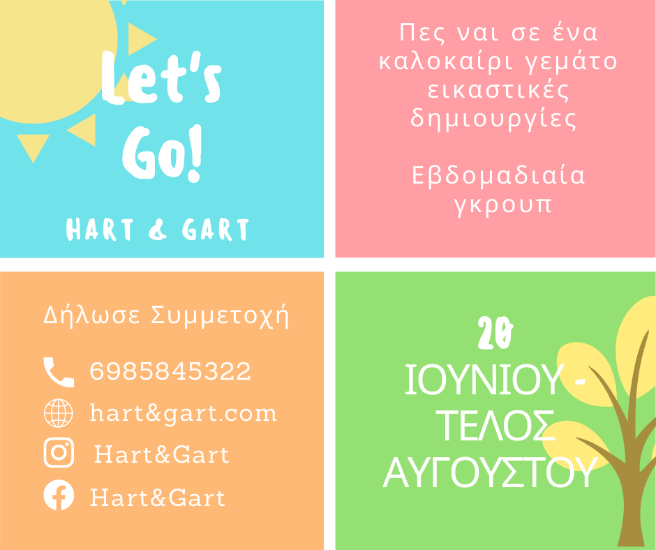 Το Hart&Gart δημιουργεί το summer camp 2022. Μέσα από πολυεπίπεδες και διαφορετικές δραστηριότητες προσπαθεί να αναπτύξει τις δεξιότητες του κάθε παιδιού ξεχωριστά και την κοινωνικοτητά του. Εστιάζοντας πάντα στο κομμάτι της δημιουργίας μέσα σε ένα γκρουπ παιδιών παρόμοιας ηλικίας και βασισμένο στις καλές τέχνες δίνει την δυνατότητα να γνωρίσει διαφορετικές τεχνικές και να ανακαλύψει τι επιθυμεί. Έχουμε ετοιμάσει ένα με πρόγραμμα με αγάπη και σεβασμό προς τα παιδιά. Το πρόγραμμα μας περιλαμβάνει: Ζωγραφική, Σχέδιο, Χαρακτική, Πηλό, Κόμιξ, Κολάζ, Κατασκευές και πολλά αλλά που περιμένουν τους μικρούς φίλους να περάσουν δημιουργικά το καλοκαίρι τους!
